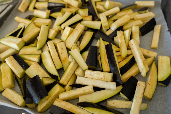 | 2. Snijd de aubergines in reepjes. Leg op de bakplaat en hussel door elkaar met wat olie en zout. Bak de aubergine 25 minuten in de oven. Hussel halverwege. |