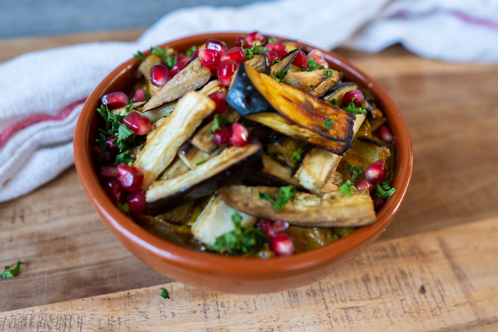 Aubergine rooster je een half uur in de oven. Hierdoor wordt de aubergine lekker zacht. Los van wat zout en olie, gaat er niks bij de aubergine. De milde smaak, gaat dan juist heel goed bij de stevige stoof. Daar zitten genoeg smaakmakers in, zoals walnoten en granaatappel melasse.