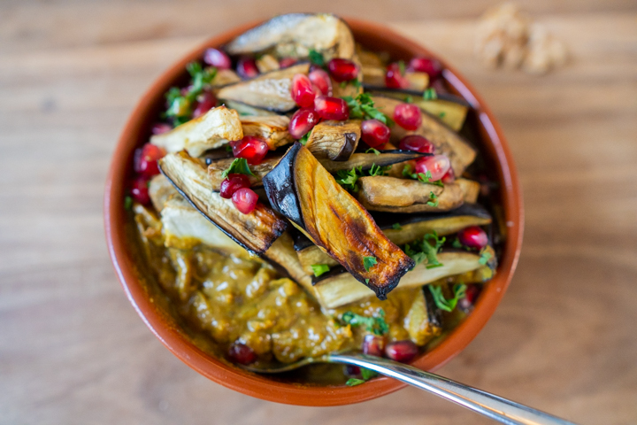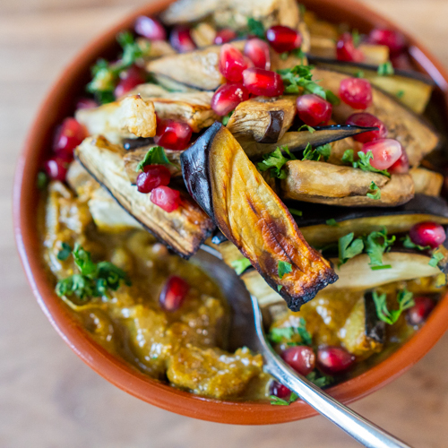 Deze Perzische stoof van walnoten en granaatappel is hartig en licht zoet. Ik maak een vegan versie met aubergine. De romige, zachte aubergine vind ik erg lekker bij de stevige stoof.