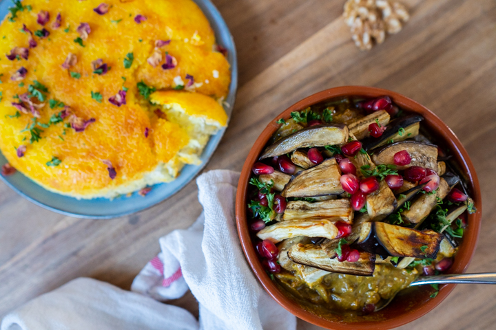 Als de saus even geprutteld heeft, roer je de helft van de geroosterde aubergine erdoor. De stoof schep je op het bord en top je af met de overige aubergine, wat peterselie en granaatappelpitjes. Serveer de rijst met tahdig of gewone rijst.