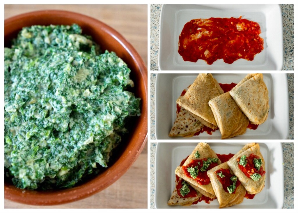 Door de amandelricotta gaat spinazie. Ui, knoflook en spinazie bak je voor. Dit doe je bij de amandelricotta in de mixer. Vervolgens maal je het geheel nog eens. Dan heb je een hele lekkere vulling. De vulling smeer je op de helft van een crespelle. De crespelle vouw je vervolgens dubbel en dan nog eens dubbel. Dan kan hij in een ovenschaal, met een dun laagje tomatensaus op de bodem. Op de crespelles verdeel je de rest van de tomatensaus. Je kunt er nog wat extra amandelricotta op verdelen en eventuele wat vegan parmezaanse kaas.