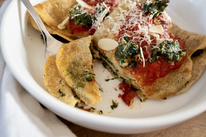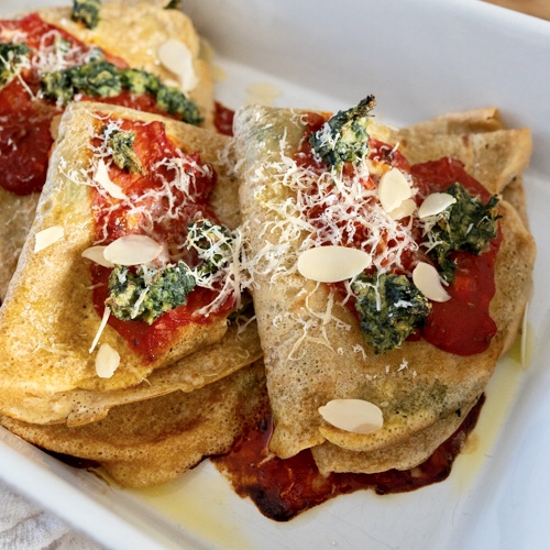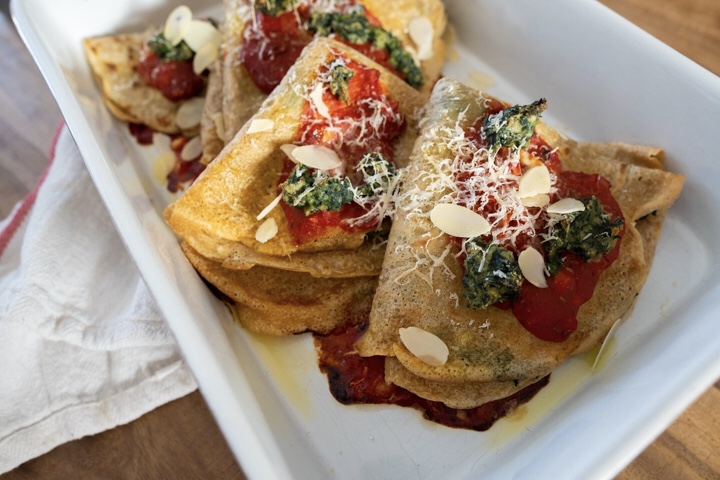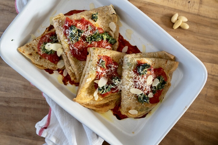 Pannenkoeken en crêpes kennen we allemaal wel. De Italiaanse variant is de crespelle. Een dunne pannenkoek, die hartig gegeten wordt. Ik maak een soort vegan versie van crespelle alla fiorentina. Gevuld met amandelricotta en spinazie, bedekt met tomatensaus. En begrijp me niet verkeerd, dit is een geheel eigen versie. Ik weet nu al dat de Italiaanse vriendin van mijn broer hem heerlijk zal vinden, maar mijn versie met amandelricotta niet de originele naam zal geven.