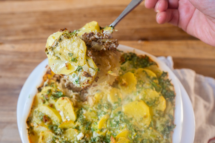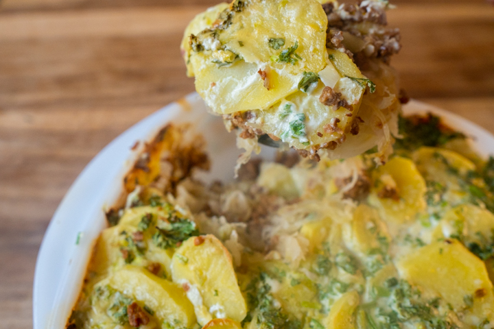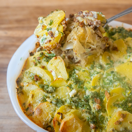De bodem van een ovenschaal bedek je met de zuurkool, gevolgd door het gehakt. Daar leg je de plakjes aardappel op, waarna je het crème fraîche mengsel er overheen giet. Dan kan de schotel in de oven. Driekwartier op 190°C. Als hij goudbruin is, dan is hij klaar.
