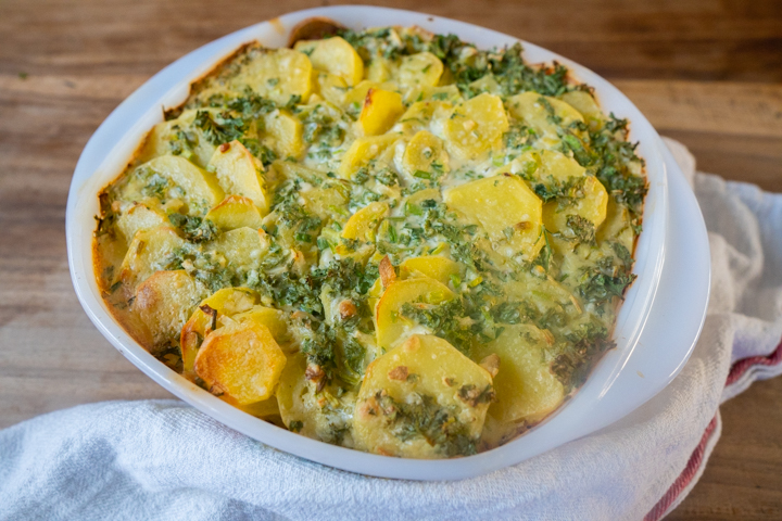 | 5. Hak de peterselie en bieslook fijn. Doe in een kom met de overgebleven knoflook, crème fraîche, water, kikkererwtenmeel en zwart zout. Meng goed door elkaar en giet het mengsel over de aardappelschijfjes. |