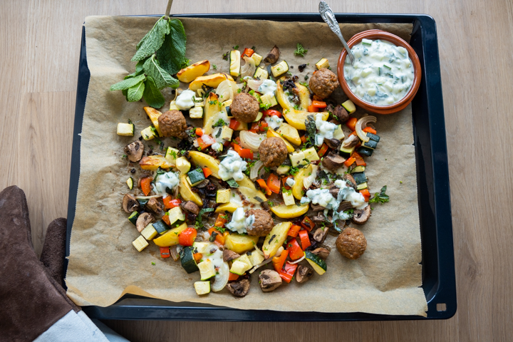 Naast de groenten gaan er vegetarische balletjes door. Je kunt het afmaken met wat vegan kaas als je wilt. Ik vind vegan mozzarella er erg lekker bij. Dan kunnen de groenten en balletjes bij de aardappels en bak je de traybake nog een kwartiertje. Bij de traybake serveer je de tzatziki.