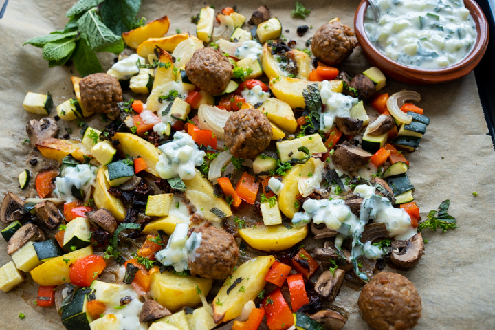 Een traybake is altijd fijn om te maken. Alles op een bakplaat en bakken maar. Ideaal dus voor doordeweeks. Dit keer maak ik een variant met vega gehaktballes, aardappels en tzatziki. Het is een simpele maaltijd, met veel smaak.