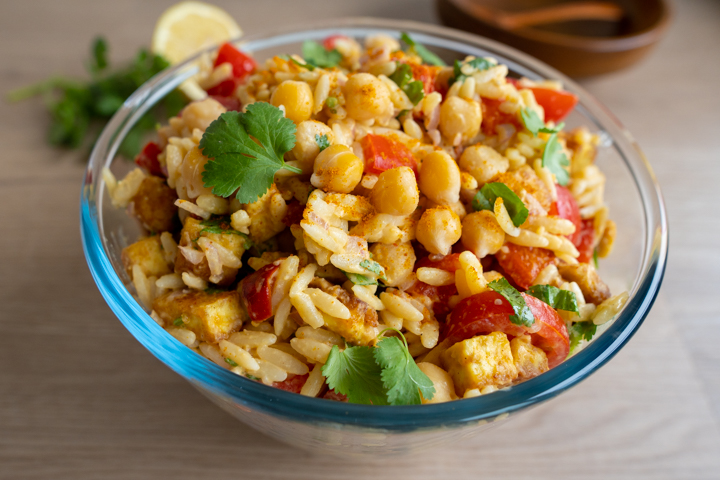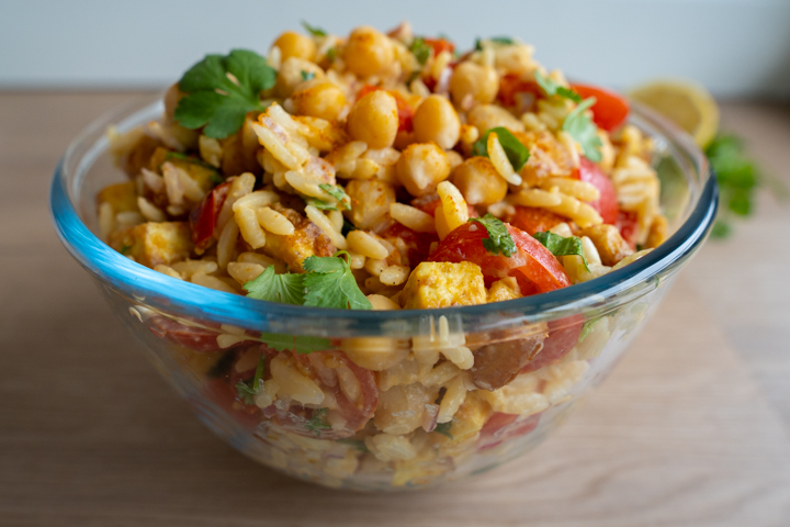 | 6. Maak de dressing in een grote kom. Doe de hummus, het sap van de citroen en wat zout in de kom. Meng door elkaar. Voeg de ui, tomaat, koriander, orzo, kikkererwten en tofu toe. Meng door elkaar. |