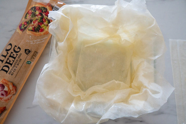 Filodeeg haal ik ook het liefst van de Turkse winkel. Daar hebben ze hem in de koelkast. Het zijn wat grotere vellen en ik vind ze veel makkelijker te gebruiken. Ik kwam hetzelfde formaat nu ook bij Albert Heijn tegen. Dus als je die kan vinden, raad ik ze aan. Als je ze niet kunt vinden, kun je natuurlijk ook filodeeg uit de vriezer nemen. Dit zijn vaak kleinere vellen, dus ik denk dat je er dan 2x zoveel moet gebruiken.