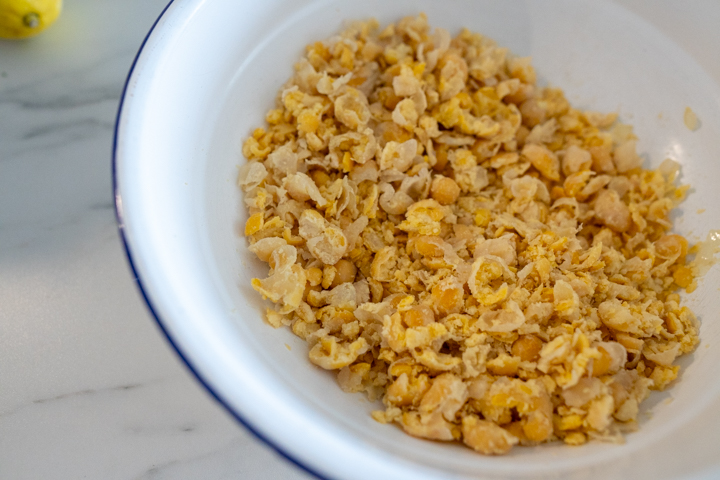 De vulling van de pastei bestaat uit kikkererwten en spinazie. Als je een blik kikkererwten neemt, kun je een blik van 800 gram nemen. Ik heb laatst weer kikkererwten gekookt en ingevroren. Als je ze ook vers hebt, kun je 480 gram kikkererwten nemen. De kikkererwten prak je met een vork of maal je kort in een keukenmachine. Het mag een beetje grof blijven. De kikkererwten voeg je toe aan de gebakken spinazie. Ook voeg je wat melk toe. Ik neem ongezoete sojamelk. Dit maakt de vulling wat smeuïger.