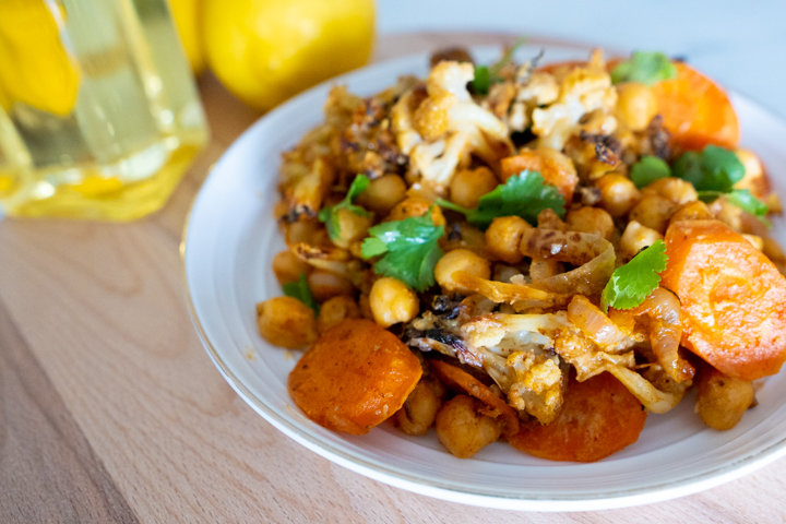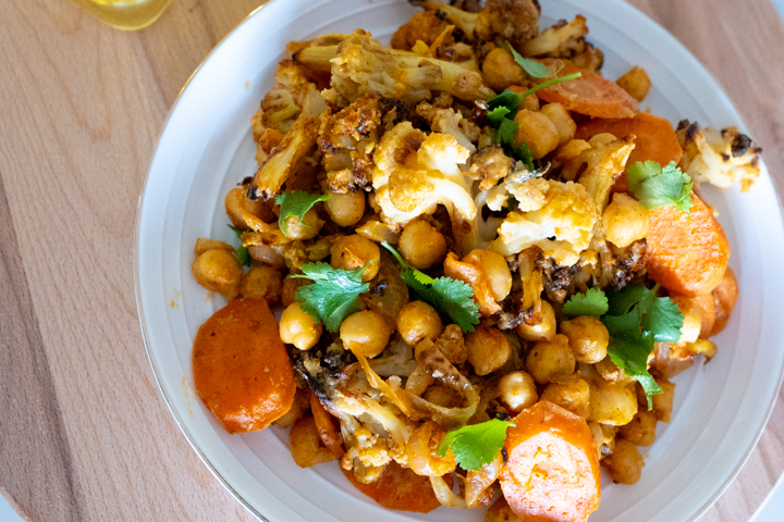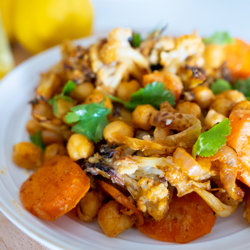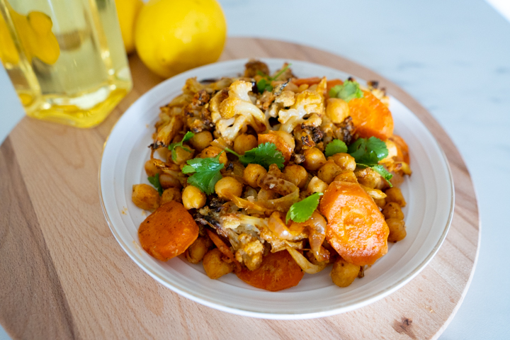 | 1. Verwarm de oven voor op 200°C. Snij de bloemkool in kleine roosjes en leg op een bakplaat. Hussel met de ras el hanout, wat olie en zout en bak een half uur. Hussel halverwege. |