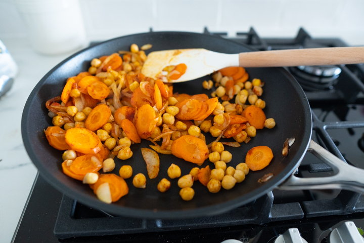 Bij de bloemkool gaat ook ui en wortel. Deze groenten zou je natuurlijk mee kunnen bakken met de bloemkool, maar door ze in de pan te bakken blijven ze wat zachter. Ik vind dat in deze salade juist lekker met de geroosterde bloemkool. Op laag vuur bak je de ui en wortel een kwartier. Als de groentes lekker zacht en zoet zijn, voeg je de kikkererwten en paprikapoeder toe. Dit bak je nog een paar minuten mee. Vervolgens kan het vuur uit.