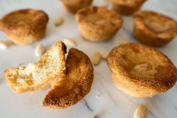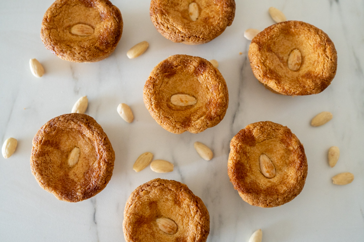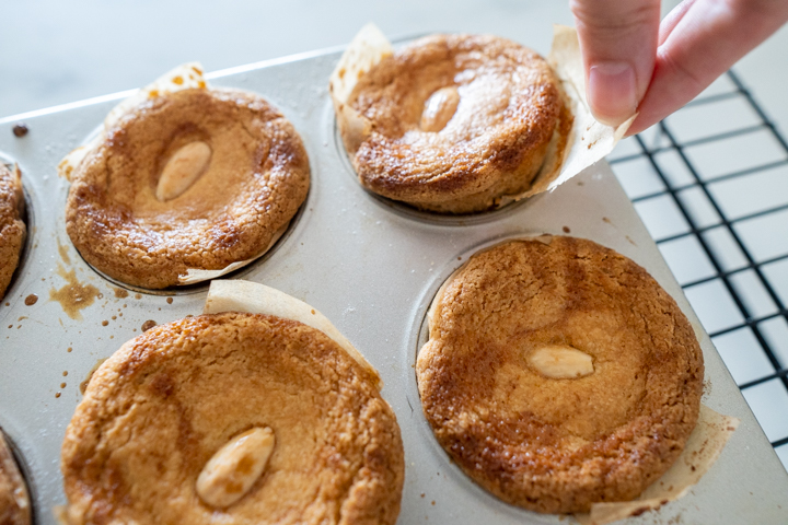 De koeken maak ik af met een amandel. Het is ook lekker om wat blokjes appel over de koeken te verdelen. Ik was dat eigenlijk ook van plan voor deze foto’s, maar daar dacht ik pas aan toen ik ze in de oven had staan. Als de koeken gebakken zijn, laat je ze even afkoelen in de vorm. Vervolgens laat je ze volledig afkoelen op een rekje, dan wordt het deeg wat steviger.