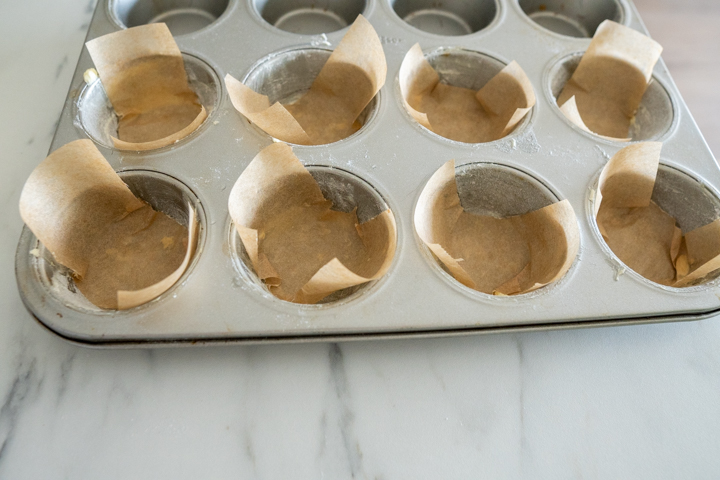 - Vet een muffinvorm goed in en bebloem de vormpjes licht. Of gebruik muffinpapiertjes.
