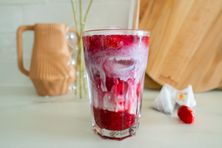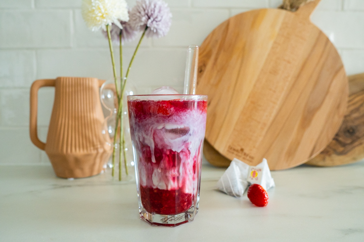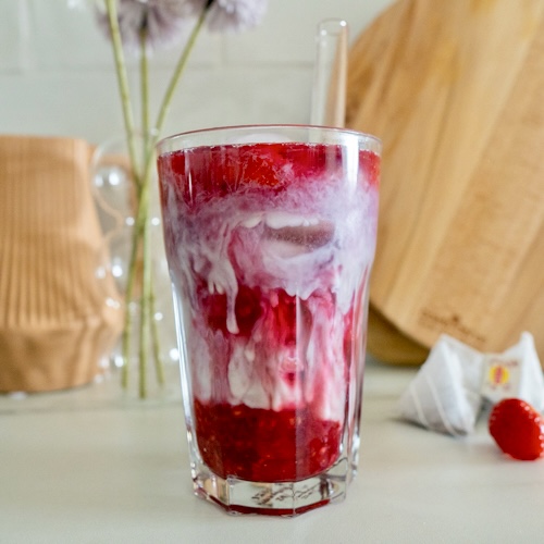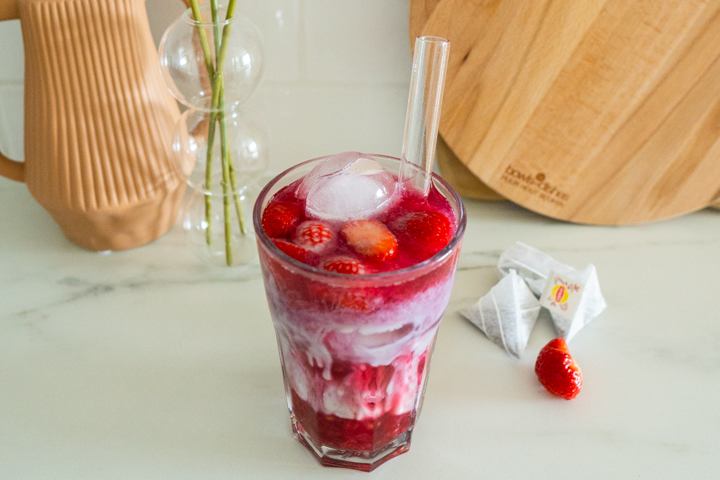 Om te serveren doe je onderin het glas wat van de aarbeien tapiocaparels. Daarna doe je wat ijs in het glas, gevolgd door de thee. Ook voeg ik wat stukjes aardbei toe als garnering. Je kunt de aarbeien hibiscus boba zo drinken, of je kunt nog wat sojamelk toevoegen. Ik doe er wat minder door dan bij de milk tea, maar vind een klein scheutje toch altijd wel lekker.