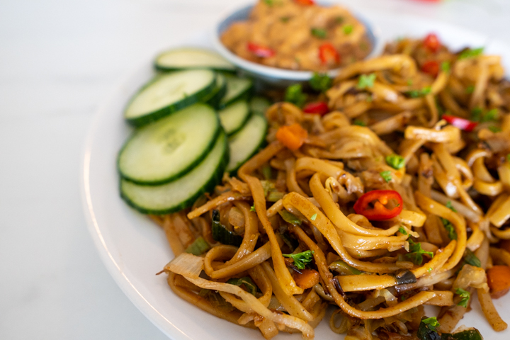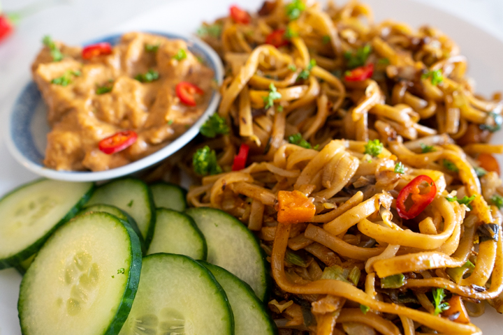 Door de bami kun je vegetarische stukjes of tofu doen en dan is het gerecht af. Ik maak er nu een simpele saté bij. Vegetarische kipstukjes bak je in een koekenpan. Daar voeg je pindakaas, sojamelk, ketjap en limoen aan toe. Ook voeg ik wat sambal toe. Voeg zoveel toe als je zelf lekker vindt. De ene sambal is de andere niet en iedereen heeft zijn eigen voorkeur qua pittigheid. Als alles gemengd is en de satésaus even geprutteld heeft, is het gerecht klaar. Serveer de bami met de saté. En ik vind het altijd lekker om er iets van atjar of gewoon plakjes komkommer bij te doen.