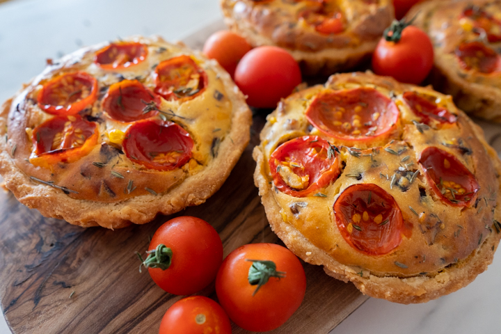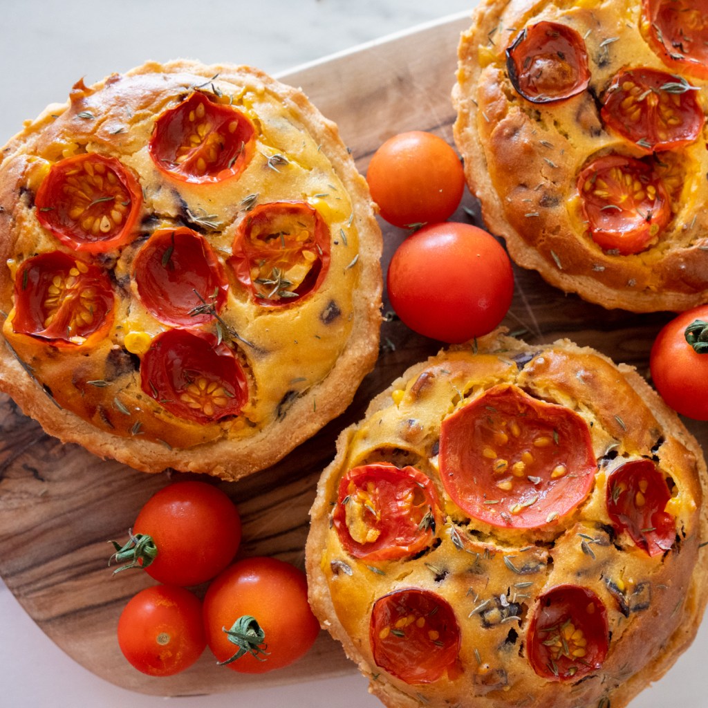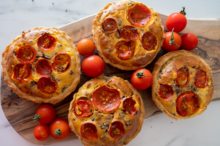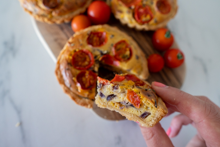 Deze mini quiches doen het goed bij een brunch of high tea. Ik maakte ze met mijn verjaardag voor mijn familie. Ik twijfelde wat ze ervan zouden vinden. Een quiche zonder ei. Maar iedereen vond ze erg lekker. De bodem is bros, de vulling romig en vol smaak en de tomaatjes zijn lekker fris.
