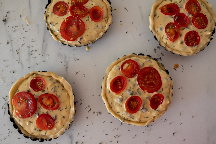 Het deeg rol je uit en je steekt er cirkels uit die iets groter zijn dan de quiche vormpjes. Je kunt ook een muffinvorm gebruiken als je wilt. Je bekleed de vormpjes ermee, waarna je de vulling erin giet. Hier verdeel je de plakjes tomaat over en als laatst strooi je er wat tijm over. De quiches bak je 20 minuten in de oven, tot ze mooi goudbruin zijn. Je kunt ze warm eten, maar koud zijn ze ook lekker.