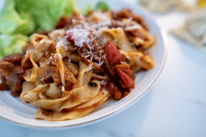 Bij een ragù vind ik verse pasta het allerlekkerst. Als de pan een uur op het vuur staat, vind ik het ook altijd wel de moeite om er dan écht wat lekkers van te maken en verse pasta te maken. Geen zin in? Ik zou dan voor tagliatelle of pappardelle kiezen.