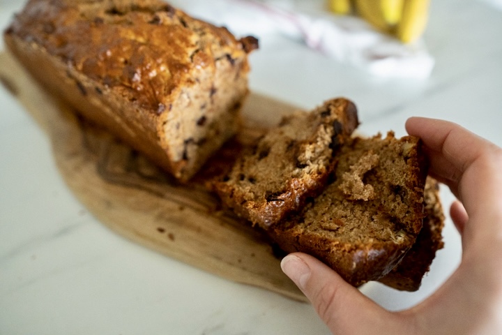 Je hebt allerlei soorten bananenbrood. Je kunt eraan toevoegen wat je lekker vindt. Ik vind walnoten altijd erg lekker. Het zorgt voor een lekkere bite. Ik ben geen groot fan van rozijnen in cake. Ik hou wel van chocola, dus ik kies voor chocoladestukjes in de cake. Je kunt een reep pure chocola in stukjes snijden. Zelf heb ik een zak bakvaste pure chocolade druppels in huis. Die kun je er zo doorheen roeren.