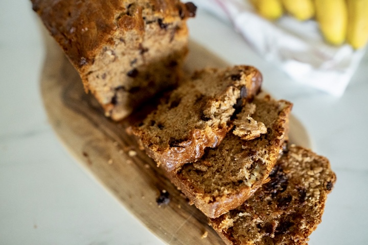 Banaan is veruit mijn favoriete fruit. Iedere dag eet ik een banaan. Overrijpe bananen maak ik dus nooit mee, maar als je rijpe of overrijpe bananen hebt is het een mooi excuus om bananenbrood te maken. Een lekkere cake met de bite van walnoten en stukjes chocola.