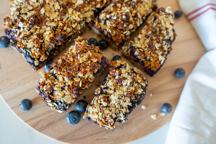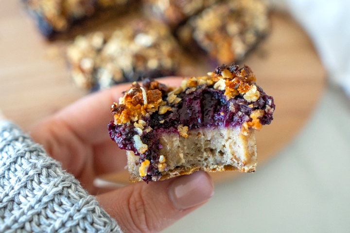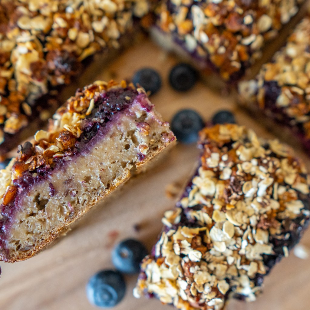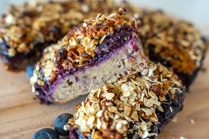 Een stevige cake-achtige bodem, met daarop een frisse bosbessenjam. Daarop is wat krokants erg lekker. Ik meng havermout met walnoten, ahornsiroop en olie. Olie zorgt ervoor dat de topping mooi bruin bakt, de suiker maakt het krokant. Samen met de jam en de bodem heb je een lekker ontbijttaartje die ook nog eens gezond is.