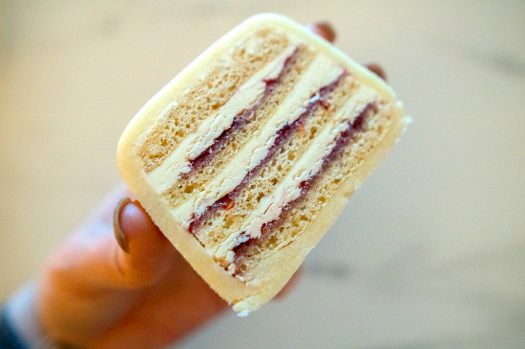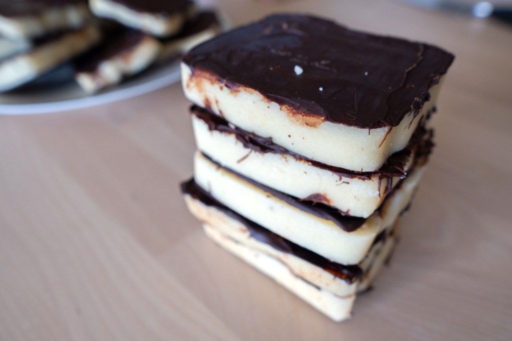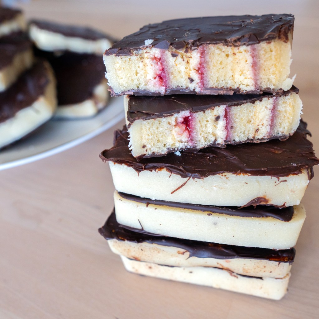 Een lekkernij uit het oosten: vegan kozakken. Laagjes biscuit, afgewisseld met botercrème en jam. Gewikkeld in marsepein en afgemaakt met knapperige chocola. Als je het niet kent, lijkt een kozak het meest op een platgeslagen mergpijp. Maar zeg dat niet te hard, want dat zou oneerbiedig zijn.