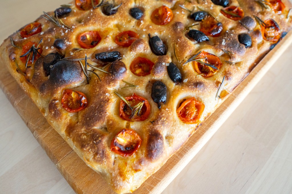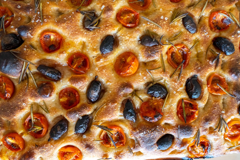 - Bak de focaccia in de oven tot het mooi gekleurd is, zo’n 30 minuten. Hou het brood de laatste 5 minuten in de gaten, zodat het niet te donker of te licht is.