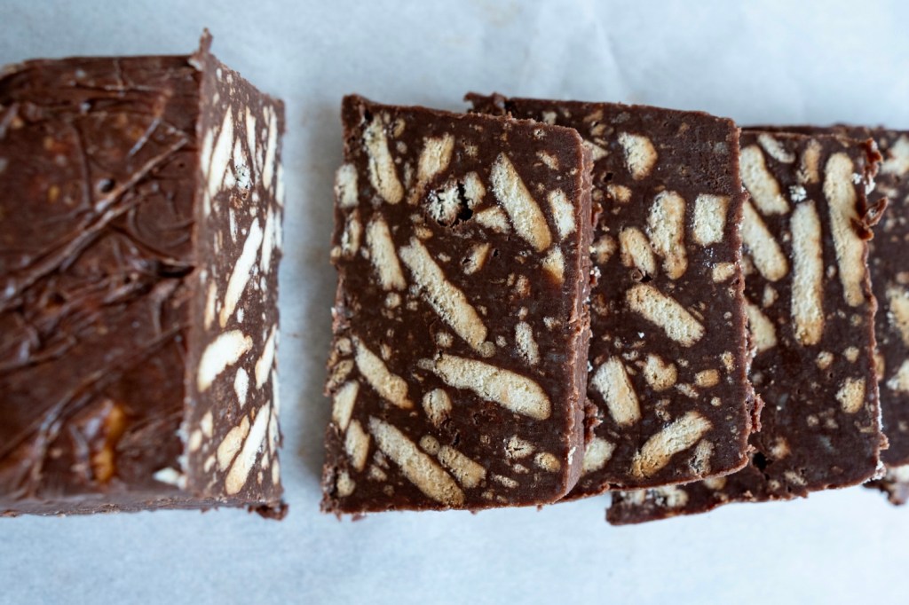 - Hak de chocola fijn en doen in een grote kom. Giet het warme melk mengsel over de chocola en roer door tot alle chocola gesmolten is. Doe dan de biscuit erbij en roer tot alle biscuit bedekt is met chocola.